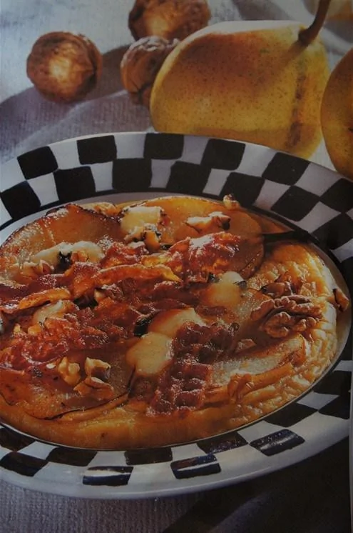 ШАГ 3 Разогреть немного топленого масла в блиннице и выложить четверть теста. Когда нижняя сторона блина немного поджарится, вдавить грушевые кружки в наполовину жидкое тесто, перевернуть блинницу и испечь блин с другой стороны до готовности. Испечь в блиннице так же остальные блины. Сверху посыпать тертым сыром и поставить в духовку при температуре 100 градусов.