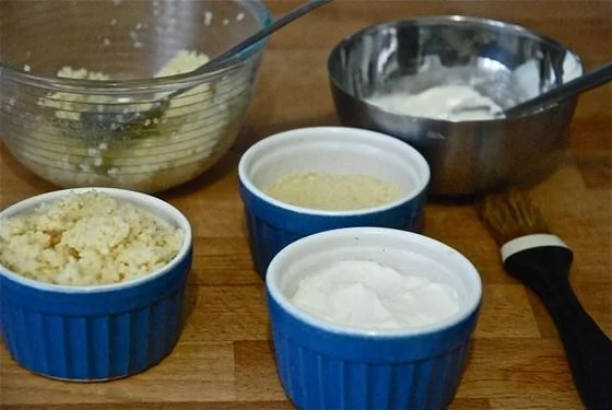 ШАГ 4 Формочки смазать маслом. Выложить до половины кускус, намазать творожной массой и снова покрыть кускусом. Разровнять и запекать 15 минут при 200 градусов.