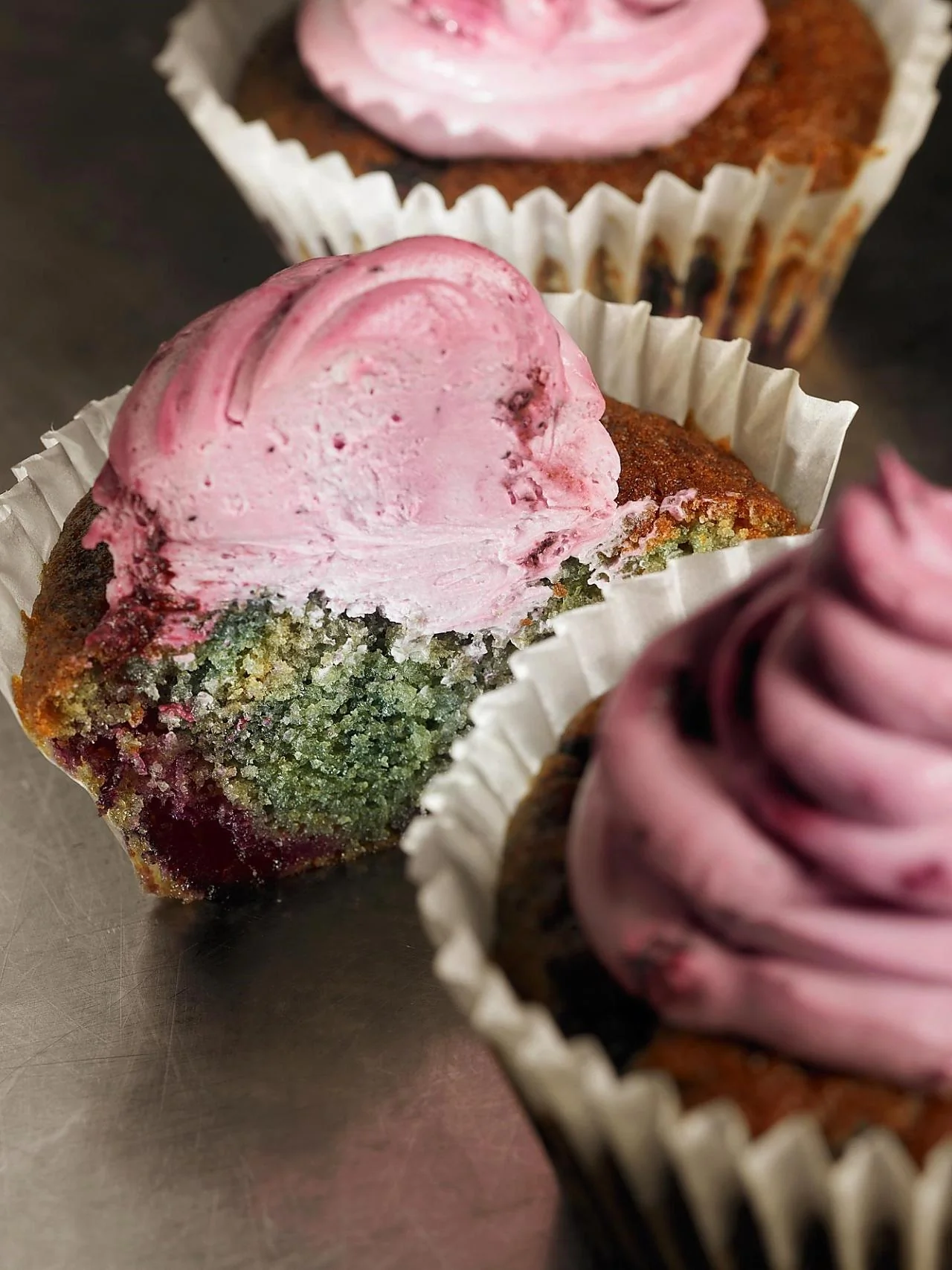ШАГ 6 Украсить кексы черничным кремом с помощью кондитерского мешка. Для большей устойчивости кремовых завитков можно вырезать в центре капкейков небольшие углубления.
