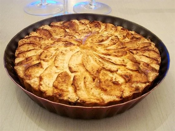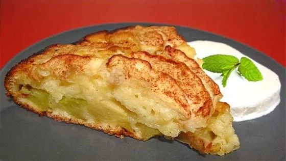 ШАГ 3 Форму смазать маслом, налить тонким слоем готовую смесь, выложить нарезанные кубиками зеленые яблоки и залить оставшейся смесью, выложить по кругу дольками всю поверхность.