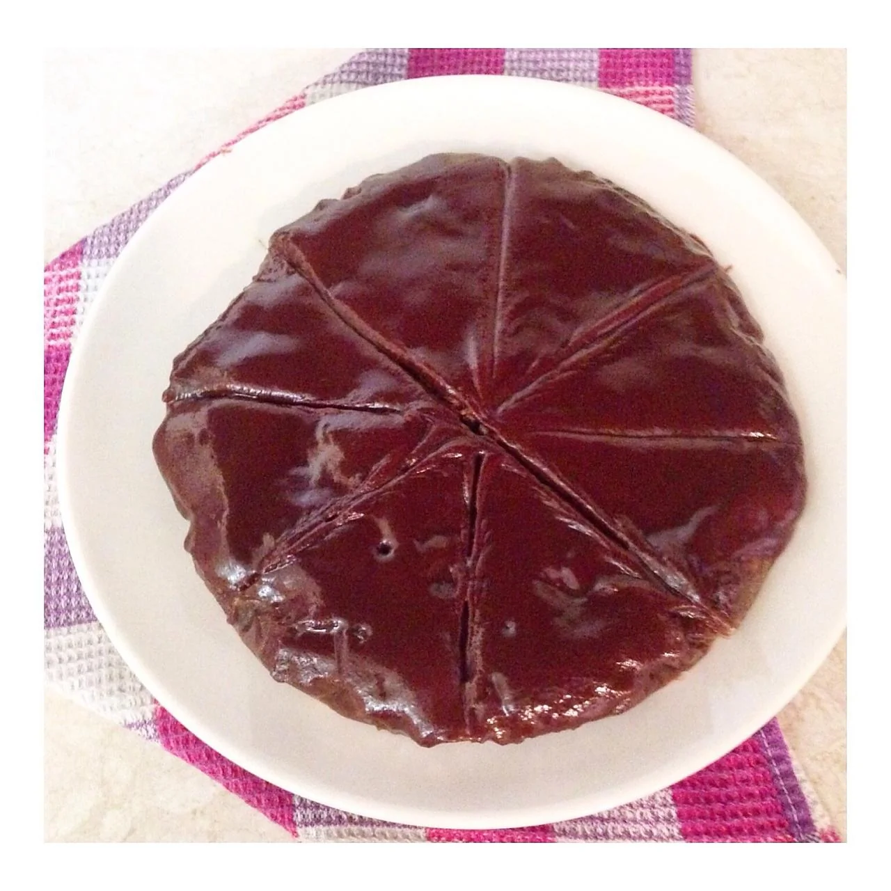 ШАГ 5 Для ганаша растопить на водяной бане шоколад (100 грамм). Снять с огня и добавить размягченное сливочное масло (50 грамм), перемешать. Готовый пирог остудить, покрыть ганашем, дать постоять 5 минут и подавать с ванильным йогуртом или мороженым.