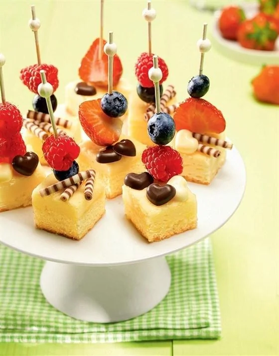 ШАГ 5 Каждый кусочек пирога украсить шпажкой с фруктами, отдельно добавить жемчужинки или шоколадные сердечки.