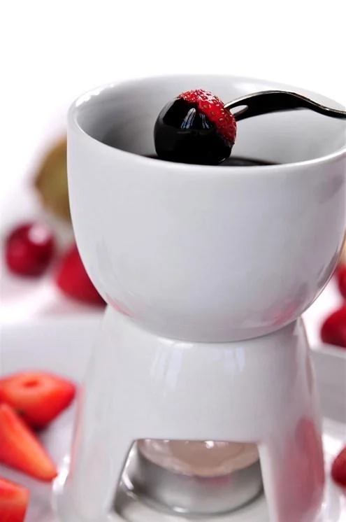 ШАГ 1 Подогреть сливки в маленькой кастрюле. Поломать шоколад на кусочки и добавить в сливки, помешивать, пока он не растает. Аккуратно размешать с коньяком (он может воспламениться). Перелить в маленький горшочек для фондю, стоящий над небольшой свечкой.