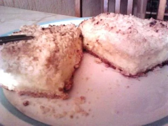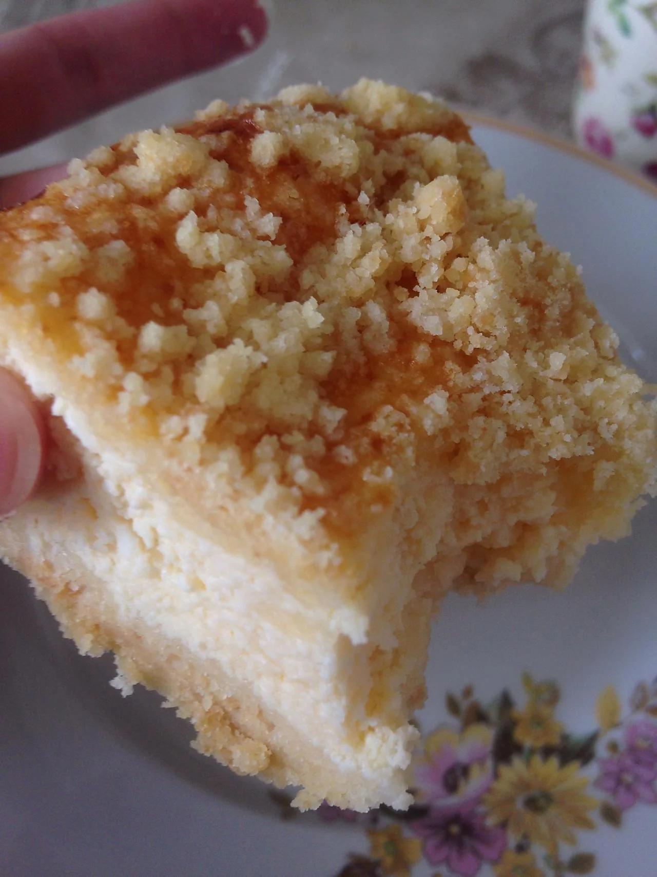 ШАГ 5 Взбитую массу из творога, яиц и сахара аккуратно и медленно выливаем в форму для запекания, и оставшейся частью теста посыпаем сверху.