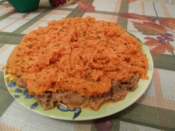 ШАГ 4 Для второго слоя натереть морковь на мелкой терке.