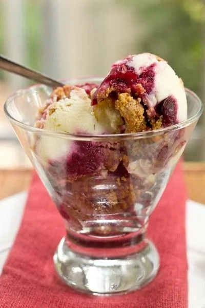 ШАГ 5 Заполните 0,5 контейнера мороженым. На поверхности мороженого в хаотичном порядке распределите вишневый соус. Обратным концом деревянной ложки аккуратно помешайте мороженое, вырисовывая ложкой цифру 8. Не смешивайте мороженое и соус в однородную массу. Вишневая прослойка не должна полностью смешаться с мороженым. Сверху посыпьте мороженое слоем измельченного печенья. Повторите то же самое с оставшимися ингредиентами, то есть сделайте второй слой мороженого.