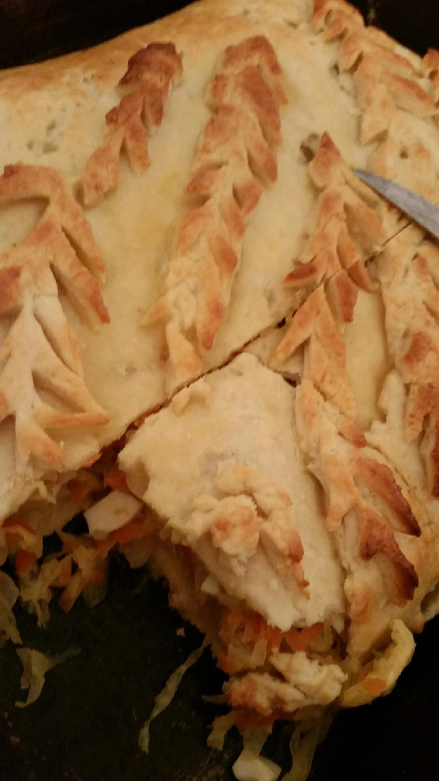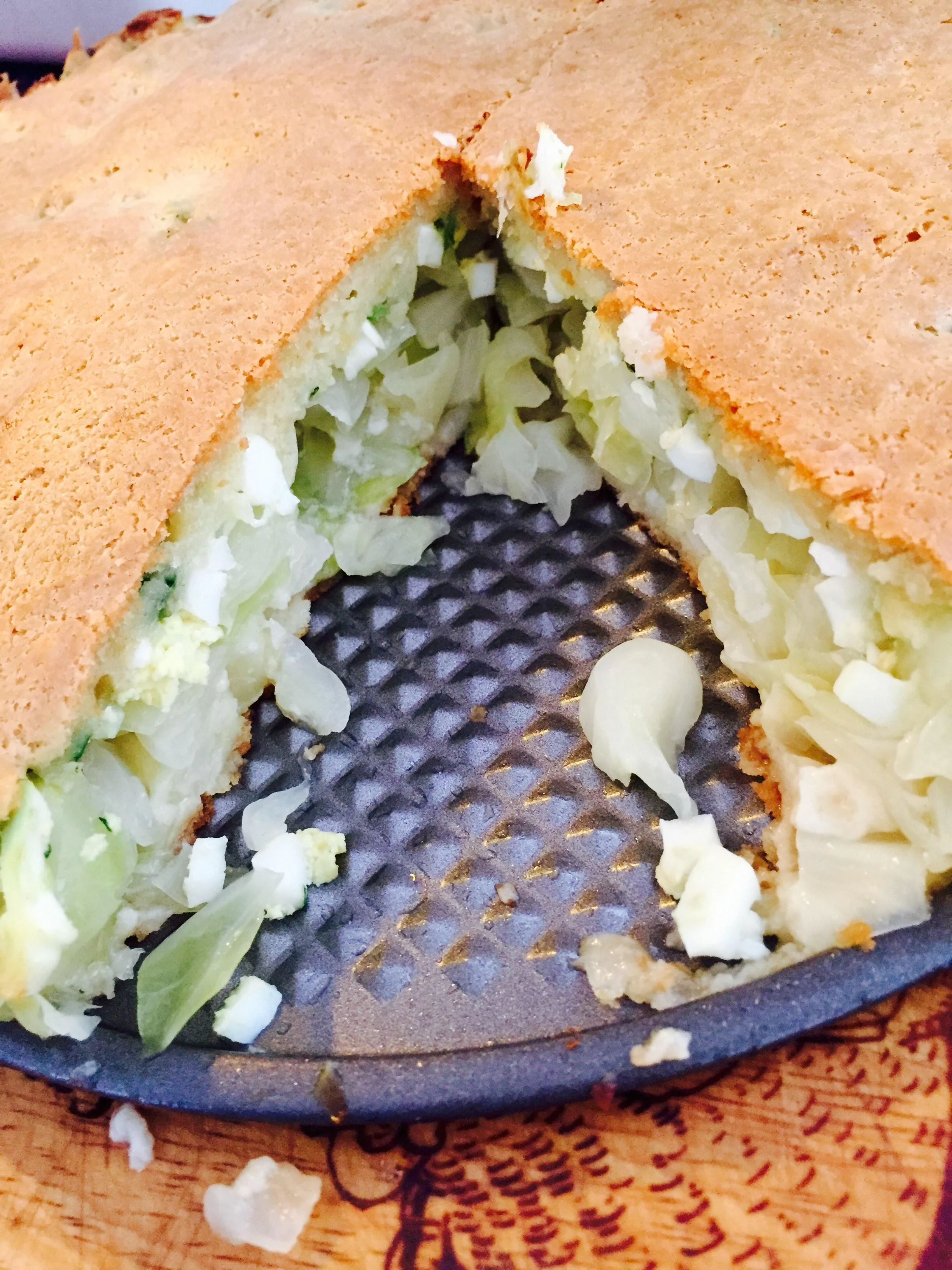 ШАГ 2 Половину теста выложить на сковороду. Сверху положить нашинкованную капусту, на нее — 2 вареных мелко нарубленных яйца и небольшие кусочки масла. Накрыть оставшимся тестом. Поставить пирог в духовку, разогретую до 200 градусов. Выпекать 30–40 минут.