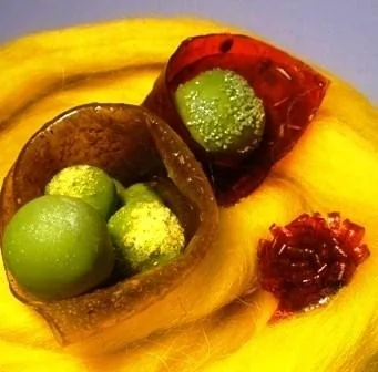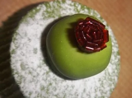 ШАГ 3 На водяной бане растопить белый шоколад с добавлением какао-масла и порошка матча, окунуть в шоколад шарики из малиново-розмаринового ганаша, насаженные на шпажки украсить их разноцветным сахаром, обернуть мармеладными листами…. Вуа-ля, съедобный букет готов!