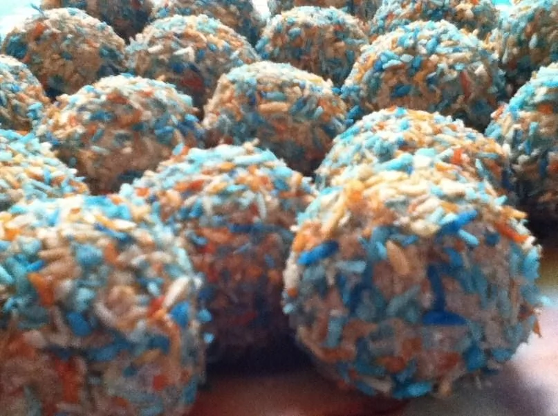 ШАГ 3 Из ореховой массы скатать маленькие шарики, завернуть в лепешку из массы с печеньем, и затем — из массы с какао. Так сделатьм со всем творогом. Когда используем всю массу, обвалять шарики в кокосовой стружке. И отправить минут на 30 в холодильник.