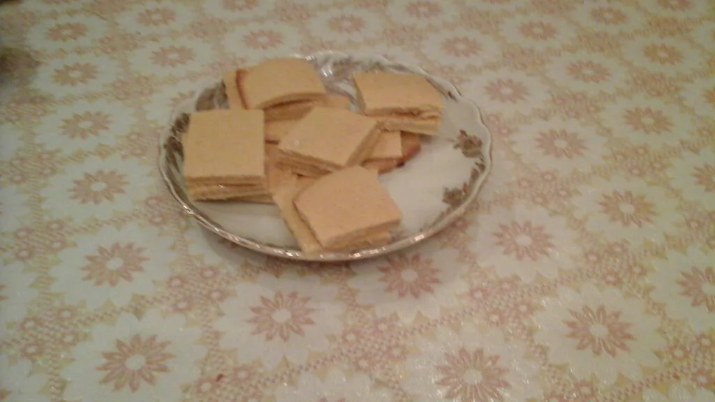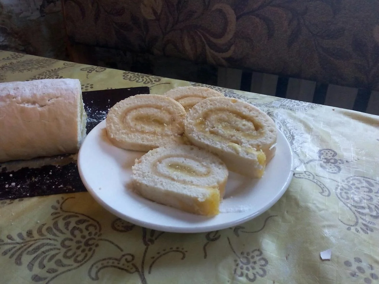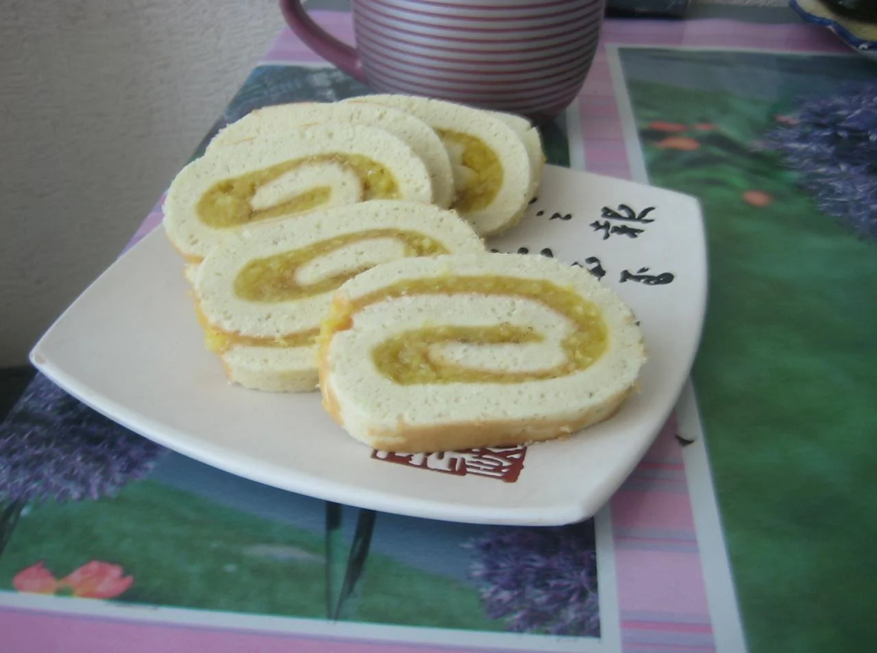 ШАГ 4 Когда бисквитный рулет будет готов, выньте из духовки, выложите на полотенце, смажьте лимонной начинкой и сверните в рулет.