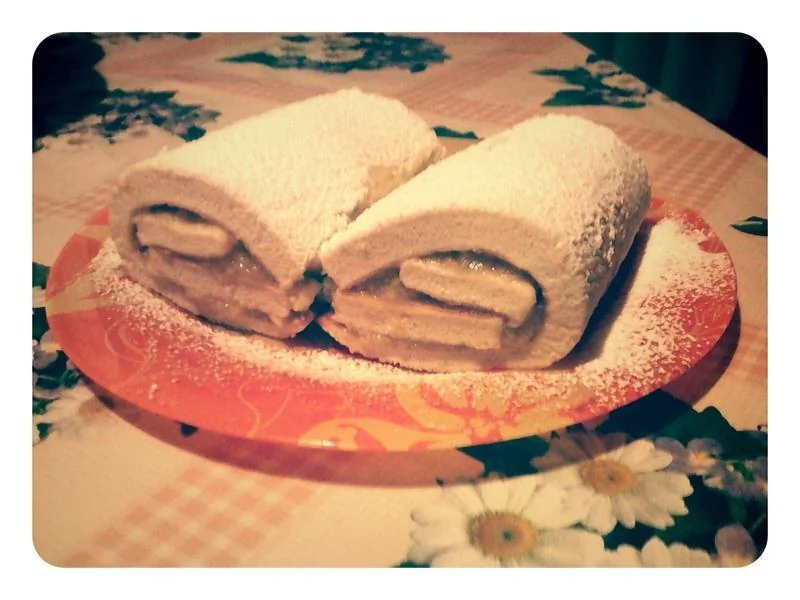 ШАГ 5 Готовый рулет выложите на блюдо, посыпьте сахарной пудрой и подайте на стол.