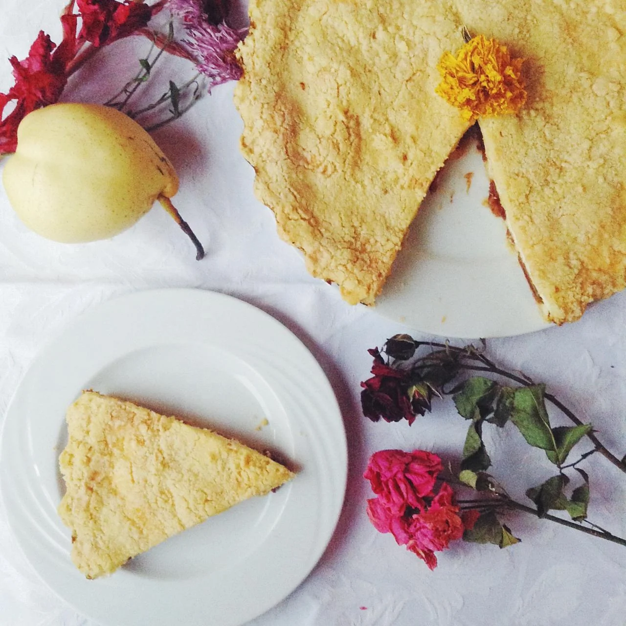 ШАГ 1 Муку разотрите с сахаром (1/3 стакана), маслом, ванилином и разрыхлителем в крошку. Выложите половину крошек в форму для выпечки, утрамбуйте равномерно по дну.