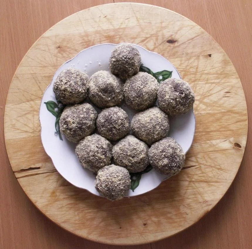 ШАГ 3 Из полученной сладкой массы вылепить небольшие колобки, по желанию обкатать их в крошках из печенья.