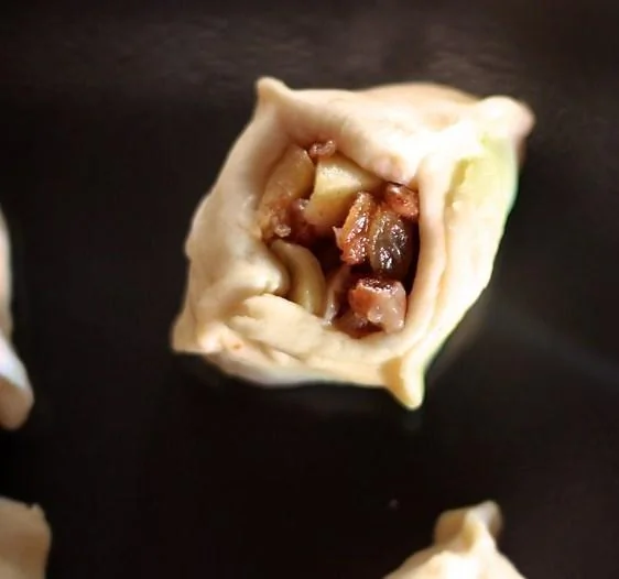 ШАГ 6 Начинка готова. Дальше простор для фантазии. Если делать открытые коробочки, как я, то тесто и начинку нужно аккуратно смазать яйцом и присыпать щепоткой сахара каждую коробочку. Выпекать при 200 градусах 10 минут и еще 10 — при 180.