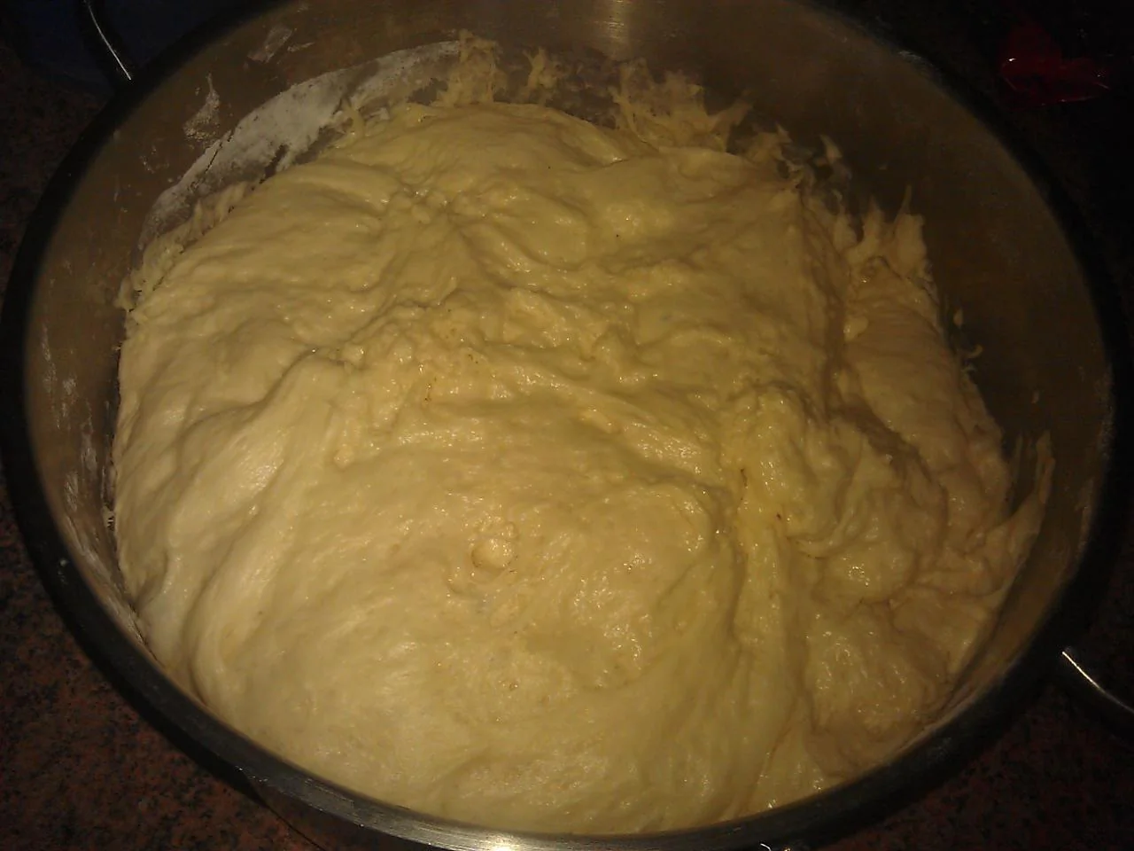 ШАГ 2 Когда опара увеличится в 2–3 раза, добавить растопленный маргарин и яйца. Муку добавлять понемногу до необходимой консистенции, тщательно вымешивая тесто (тесто должно получится чуть гуще сметаны, т.е. не должно быть плотным и в тоже время не прилипать к рукам), после замешивания, тесто накрыть полотенцем и оставить на 1–1,5 часа в теплом месте (за это время тесто должно подняться как минимум 2 раза).