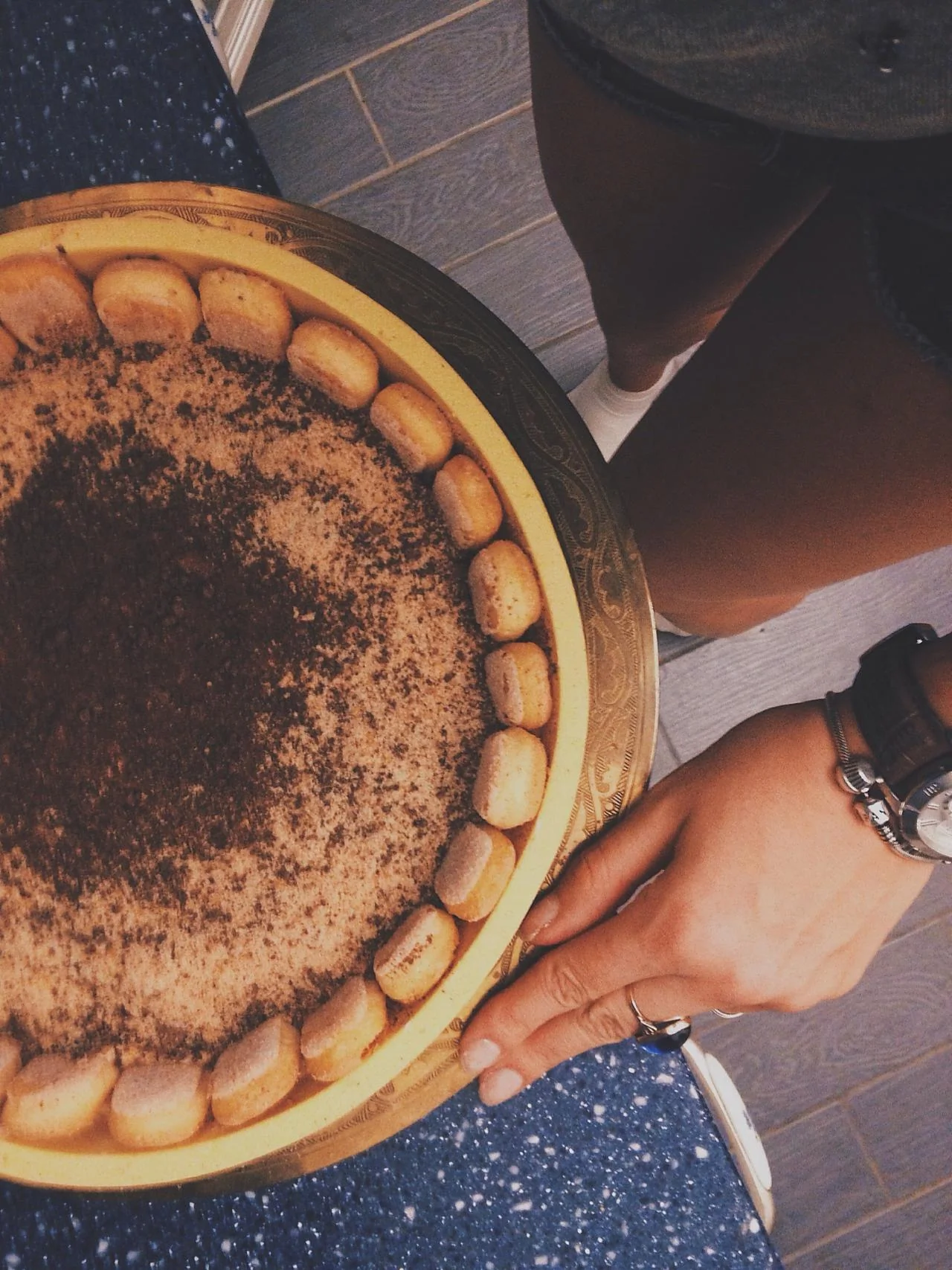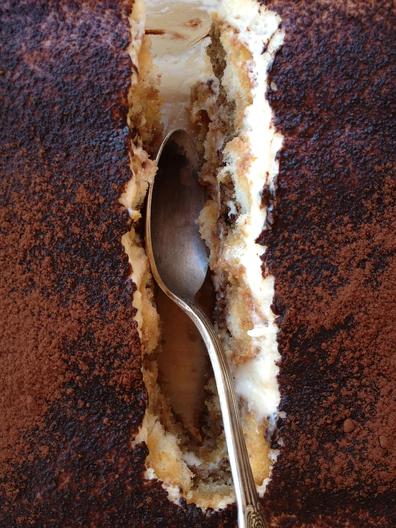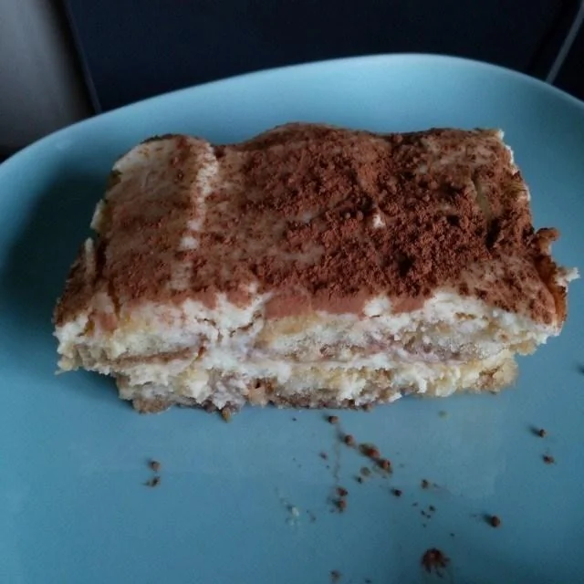 ШАГ 2 Смешать холодный кофе и коньяк. По одному окунать савоярди в кофе на пару секунд и выкладывать на дно формы. Нельзя держать савоярди в кофе долго, иначе они набухнут и развалятся. Как вариант выложить дно формы, в которой будет тирамису, печеньем и уже потом сбрызнуть сверху смесью кофе и коньяка. Покрыть печенье щедрым слоем крема, на крем просеять несладкий какао-порошок. Поверх выложить второй слой печенья, также пропитанный кофе и коньяком. Сверху распределить оставшийся крем и еще раз посыпать просеянным какао-порошком.