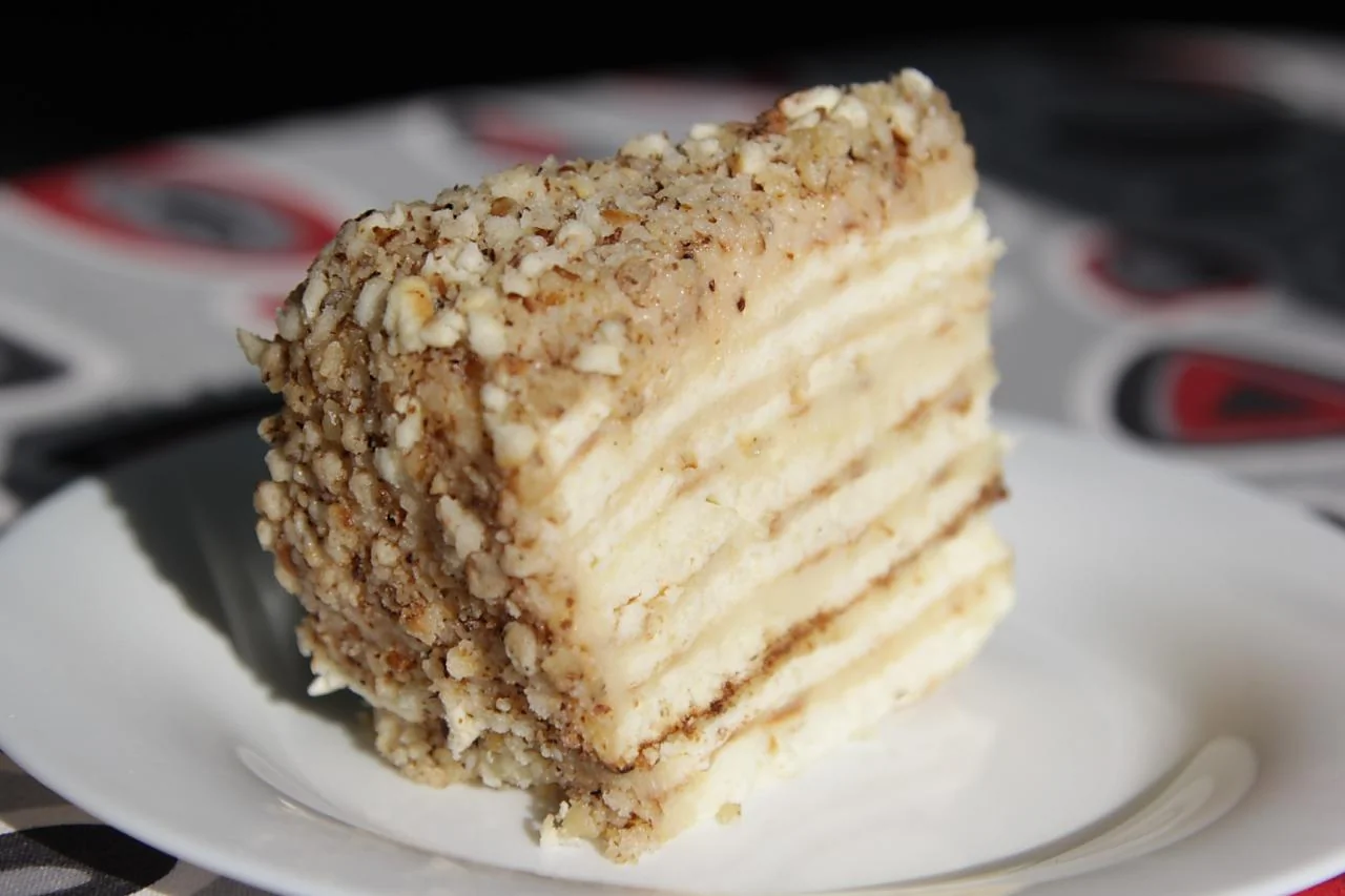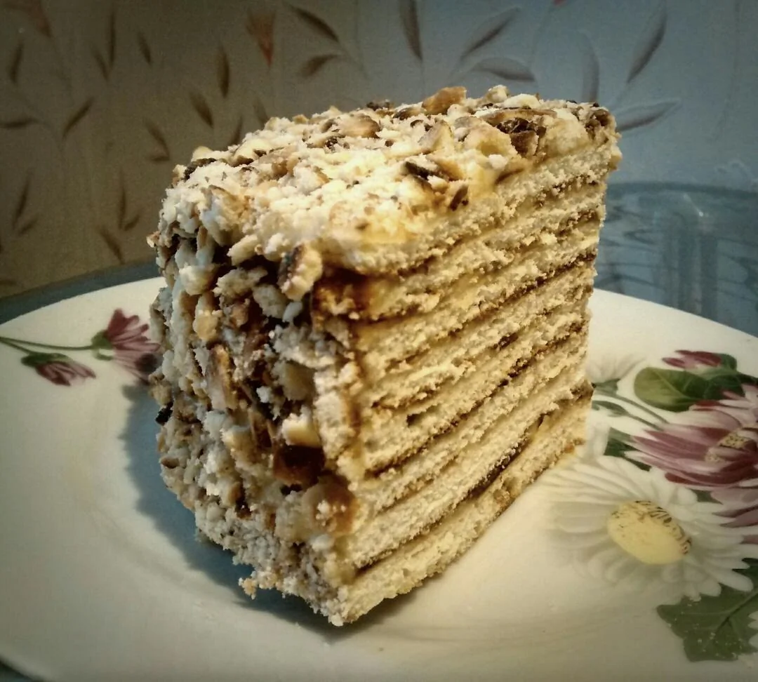 ШАГ 5 Коржи смазываем теплым кремом, верх и бока посыпаем измельченными крошками.