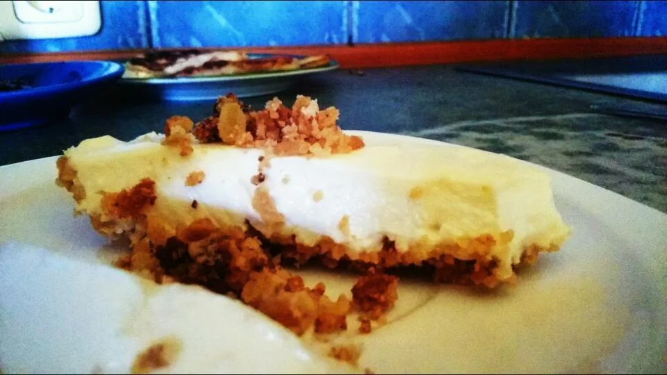 ШАГ 2 Для приготовления коржа растолочь овсяное печенье и смешать с растопленной на водяной бане шоколадкой. Выстелить тарелку для торта промасленной пергаментной бумагой и сформовать лепешку. Поставить в холодильник на 1 час.
