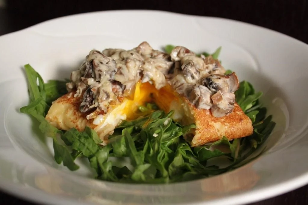 Блинчики с яйцом пашот и сливочным соусом с грибами