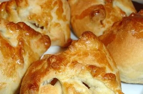 ШАГ 4 В середину выложить начинку. Залепить два противоположных по диагонали края, потом другие два. Оставшиеся прорези как следует залепить (слоеное тесто может раскрыться в духовке, залеплять надо тщательно!!!).