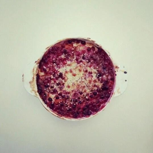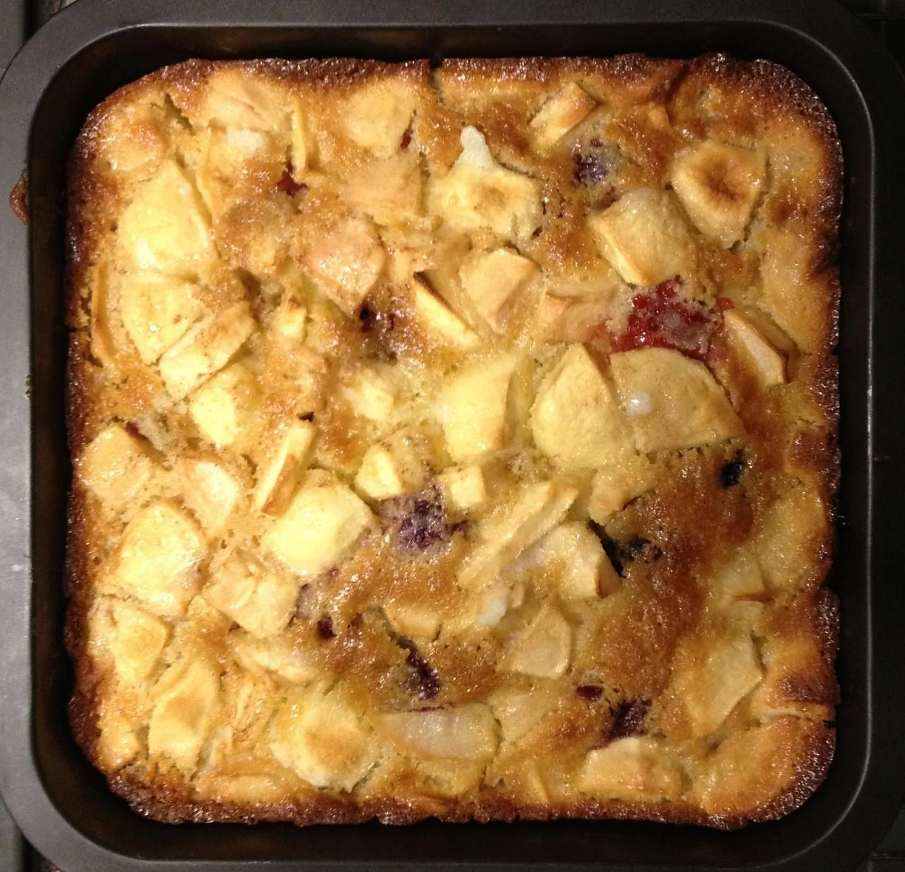 ШАГ 4 Смажьте форму для выпечки маслом. Влейте в форму тесто. Выложите сверху яблоки и вдавите их в тесто. Добавьте ягоды (я брала замороженную ежевику и немного клубники, черника была бы еще лучше) и так же их слегка утопите.