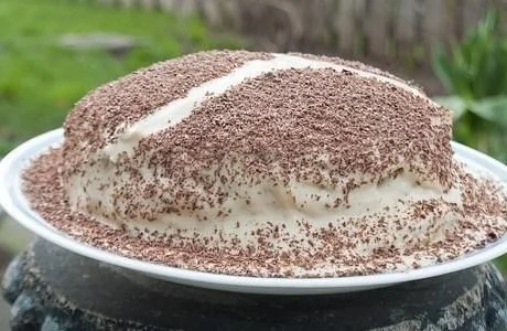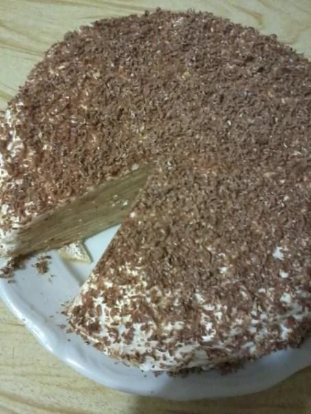 ШАГ 4 Нанесите крем между каждым слоем блинов. Поставьте торт в холодильник на час. Через час оставшийся крем нанесите поверх торта, сверху натрите шоколад и поставьте готовый торт в холодильник на 2 часа.