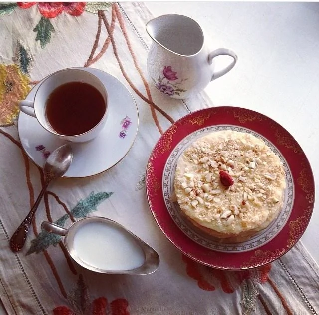 ШАГ 4 Промазать первый корж кремом, уложить на него второй, промазать кремом, уложить и промазать кремом третий, а сверху измельчить в крошку четвертый. Готовый торт убрать в холодильник на ночь, а лучше — на сутки.