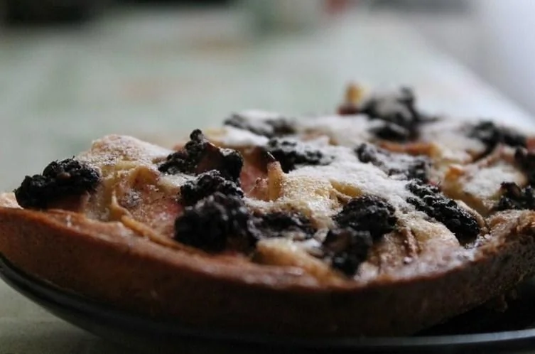 ШАГ 5 Смажьте форму для выпечки маслом и слегка присыпьте сахаром. Влейте в форму тесто. Выложите сверху яблоки и присыпьте ежевикой. Слегка вдавите яблоки и ежевику в тесто.