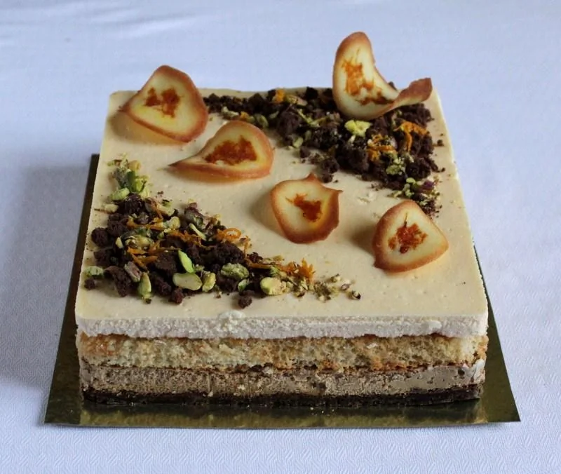 ШАГ 7 Извлеките торт из формы. Подравняйте края. Украсьте крошкой шоколадного печенья, молотыми фисташками и апельсиновыми твилями.