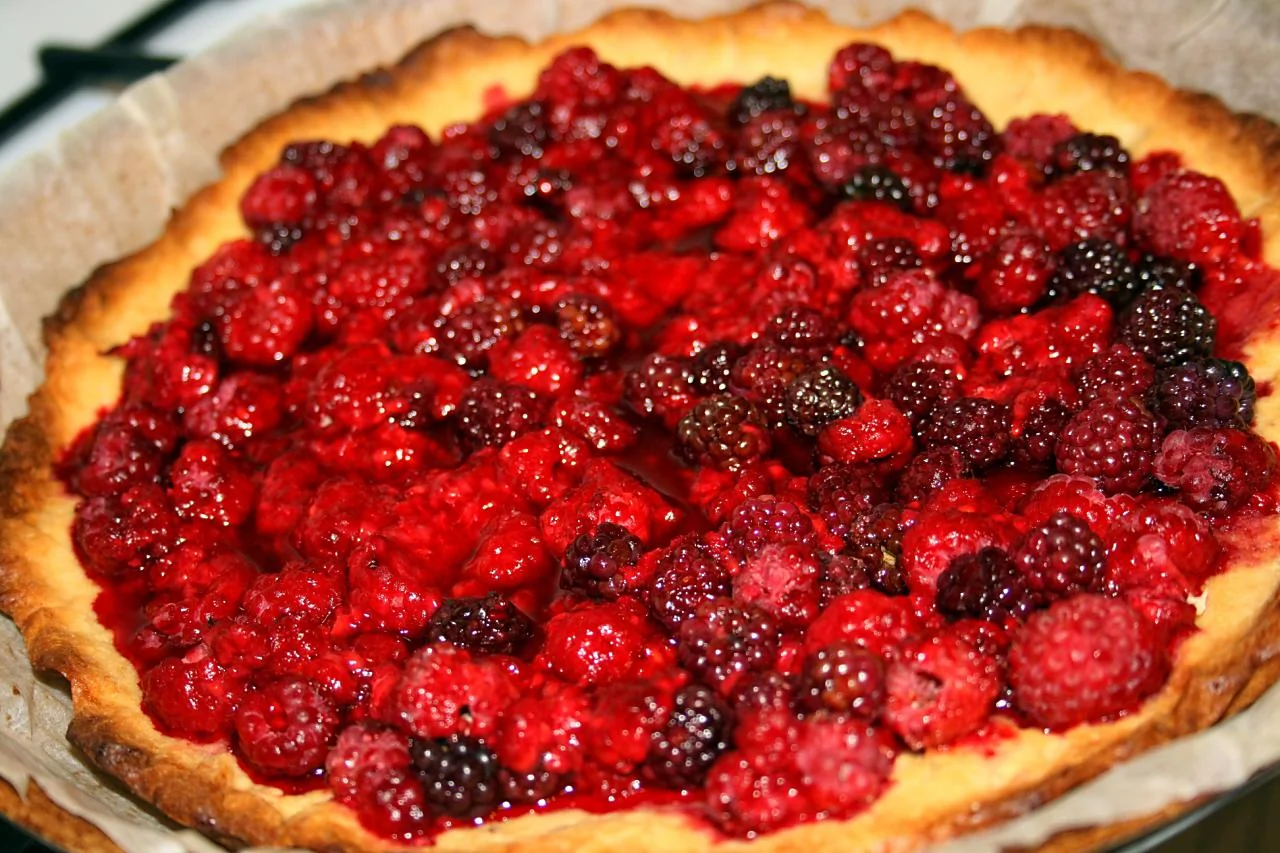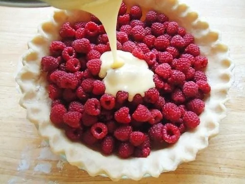 ШАГ 3 Тут все очень просто! Берем малину, кладем в кастрюлю или сковородку с тефлоновым покрытием, добавляем немного сахара и нагреваем. Лучше, когда ягодки будут целыми, это придает пирогу свежий вид. Нагрели, появился сок — можно снимать с плиты.