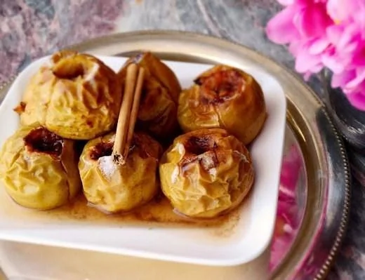 ШАГ 3 Смешать мед, сахар и корицу и начинить им яблоки, заполняя отверстие. Поставить в духовку на полчаса, и затем остудить в течение 10 минут.