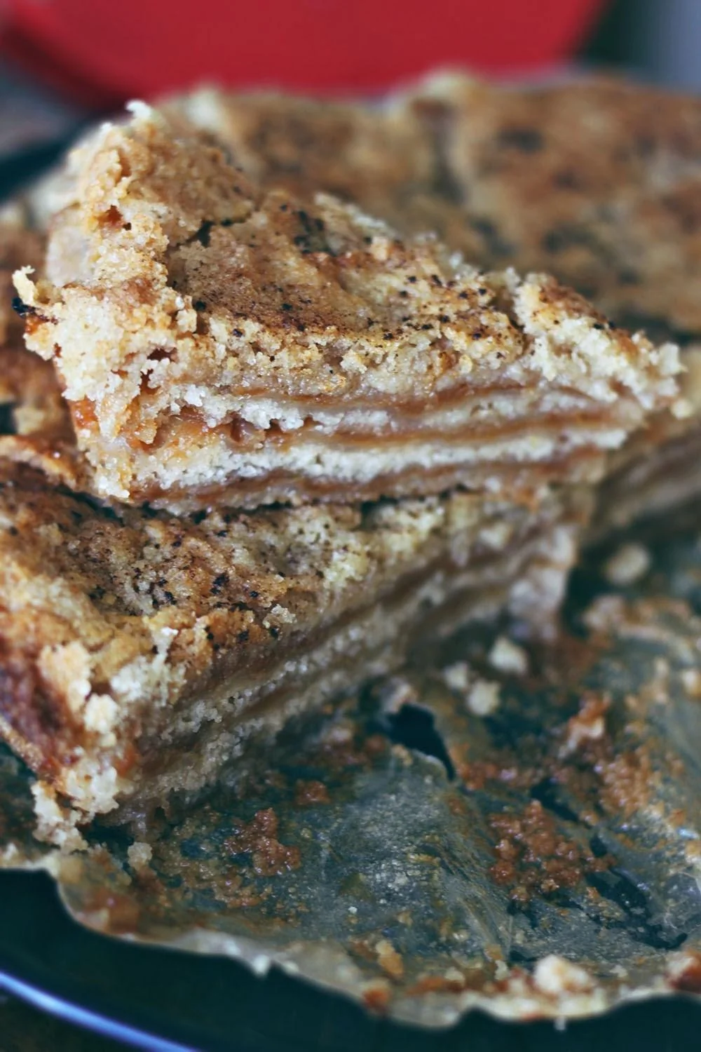 ШАГ 4 Насыпаем на дно формы часть сухой смеси — слой должен быть не слишком толстый, и разравниваем. Затем выкладываем натертые яблоки — слоем, примерно, такой же толщины, разравниваем. Чередуя слои, выкладываем всю сухую смесь и яблоки, последним должен быть сухой слой. У меня вышло три сухих и два яблочных слоя. Сверху натираем на терке сливочное масло.
