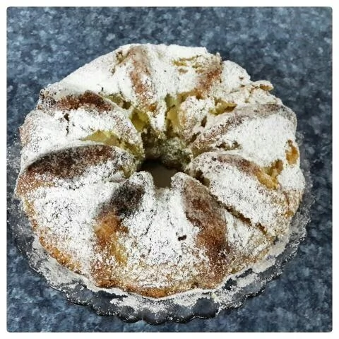 ШАГ 3 Просейте муку и добавьте в яйца, а также разрыхлитель, ванильный сахар и яблоки. Все смешайте.