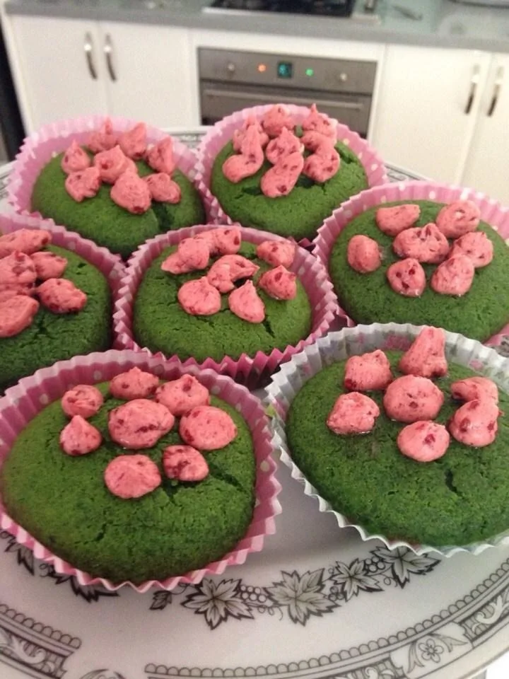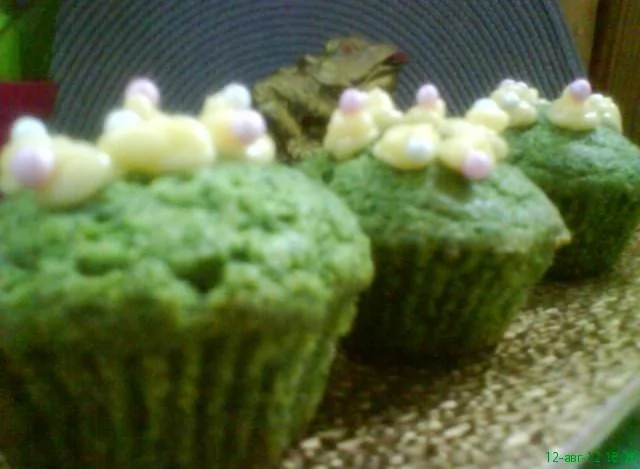 ШАГ 9 Украсить маффины короной. В центре каждого маффина по кругу выдавить из пакета маленькие стебелечки и каждый украсить сахарной бусинкой. Поставить на 10–15 минут в холодильник.