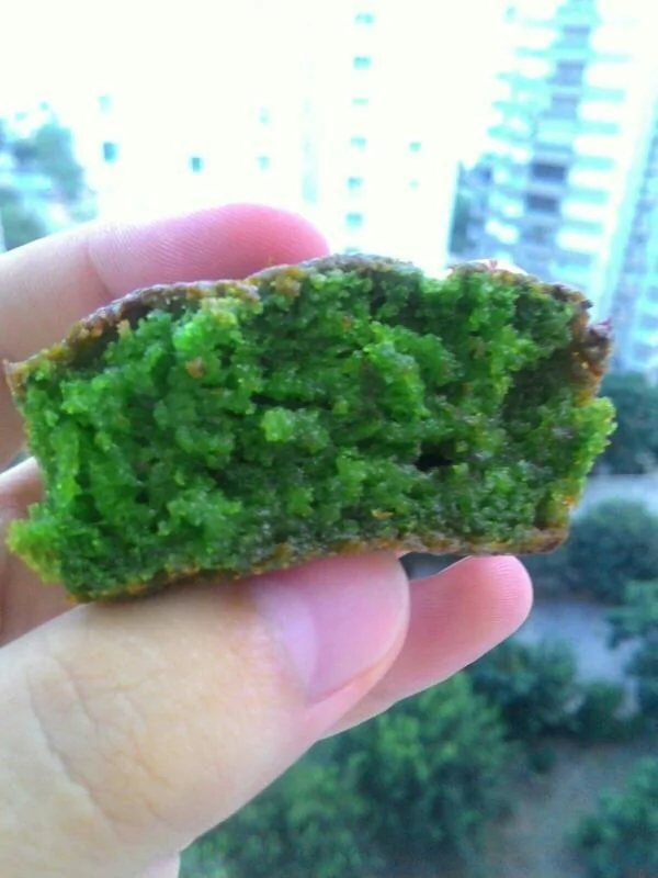 ШАГ 4 Муку смешать с пекарским порошком и добавить в нее яичную и шпинатную смеси и растопленный шоколад. Все смешать до однородного состояния.