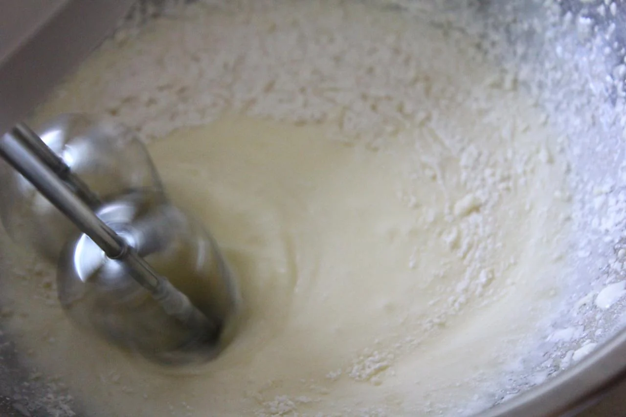 ШАГ 2 Продолжая взбивать, добавляем полстакана сметаны.
