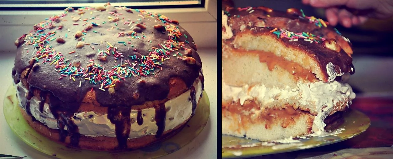 ШАГ 17 Для глазури понадобится масло сливочное — 50 грамм; какао — 2 столовые ложки; сахар — 3 столовые ложки; сметана — 3 столовые ложки; арахис — 50 грамм.