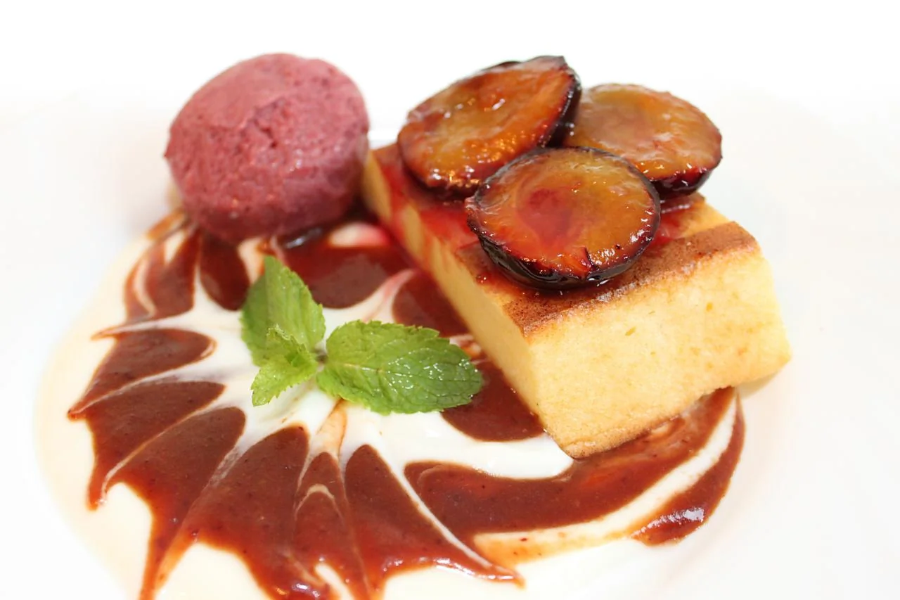 ШАГ 3 На тарелки выложить по 2–3 ложки йогурта, сверху налить сливовый соус, сделать разводы зубочисткой. Запеканку украсить карамелизованными сливами. Можно добавить шарик мороженного и листик мяты.
