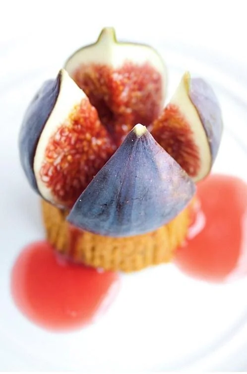 ШАГ 7 Для презентации, срезать ровно верхушку кекса и положить его на тарелку вверх дном. Инжир надрезать крестообразно и выложить сверху на кекс. Чайной ложкой аккуратно полить малиновым сиропом инжир на кексе так, чтобы сироп стекал по стенкам кекса на тарелку.
