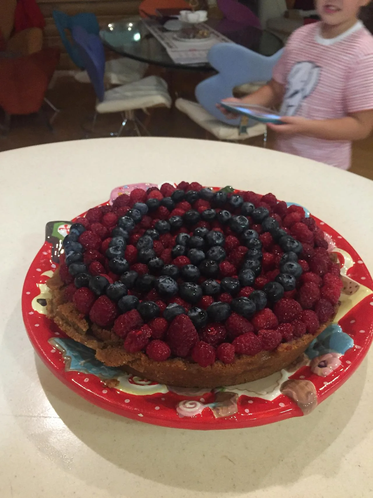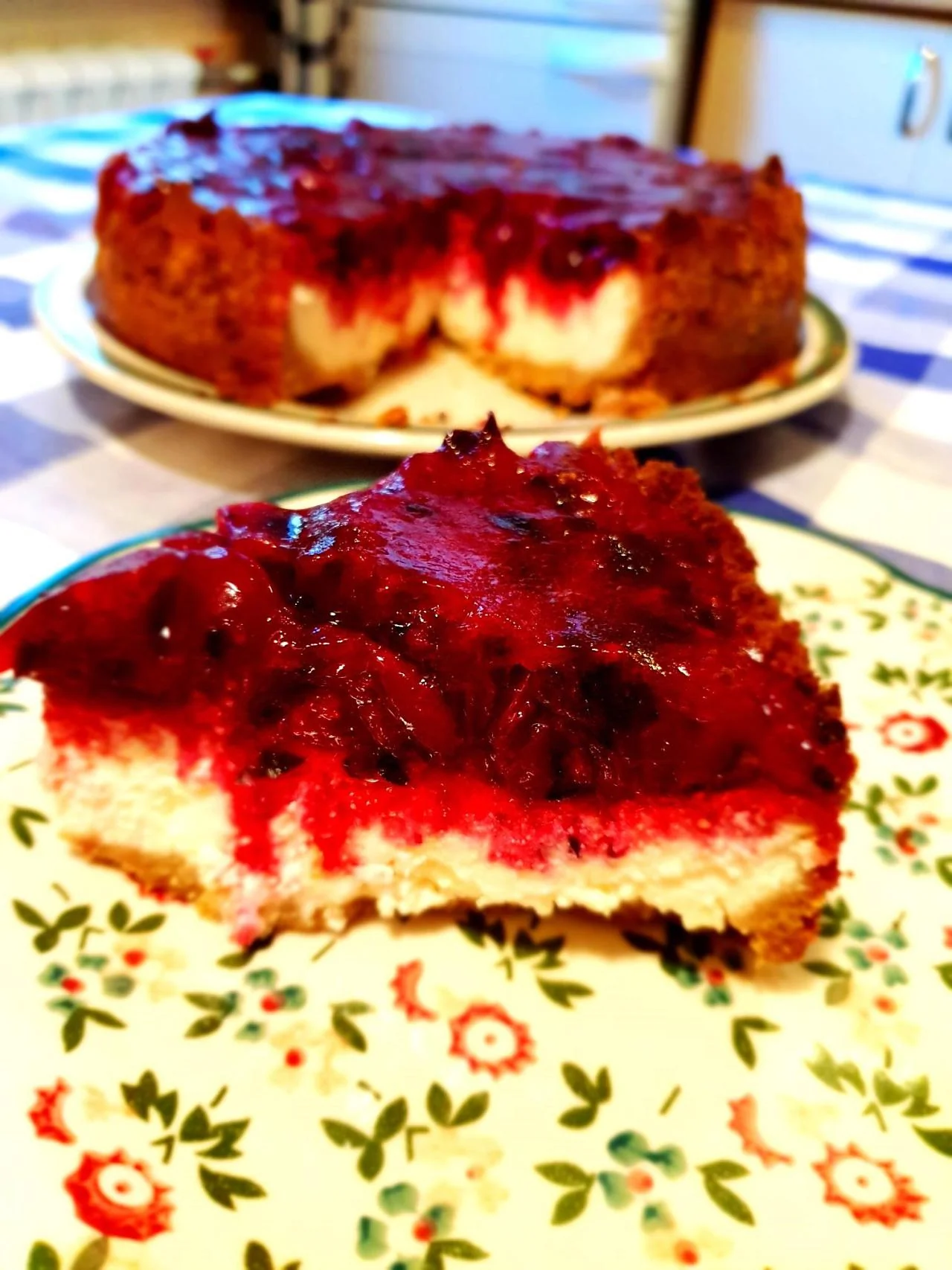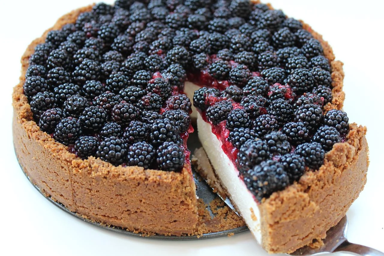 ШАГ 9 Клубнику и половину ежевики измельчить блендером до получения однородной массы. Выложить ее на пирог, хорошо распределить по поверхности. Украсить чизкейк оставшейся ежевикой.