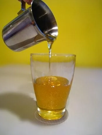 ШАГ 2 Сварив сироп, немного охладим его и добавим раствор соды (для этого соду разведем десертной ложкой воды). При этом начнется бурное пенообразование, которое длится 5–10 минут. Как только пенообразование закончится, сироп готов. Он имеет желтый цвет и консистенцию молодого жидкого меда.