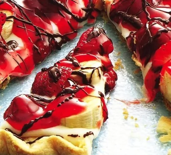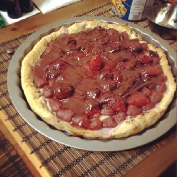 ШАГ 8 Полить пирог клубничным джемом и растопленным шоколадом для украшения.