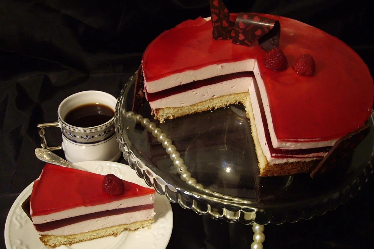 ШАГ 7 Следующим слоем вылить часть желе, убрать торт в холодильник. На желе выложить сливки, последним слоем снова желе. Охладить. Украсить.