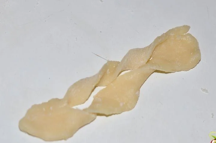 ШАГ 5 В кипящее масло опустить розанец. Шумовкой погрузить тесто вертикально и удерживать. Когда розанец начнет розоветь, на это потребуется не более минуты, его осторожно достать из кастрюли. Дать стечь лишнему жиру и переложить изделие на тарелку для остывания.
