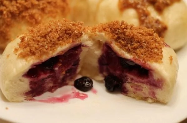 ШАГ 3 Тесто наше подошло и мы его начинаем делить на нужного размера кусочки. Из сформированных шариков растягиваем лепешку, а в середину укладываем начинку — халву и голубику с сахаром. Укладываем в пароварку, смазав предварительно низ гамбовцев маслом и убираем на 20 минут отдохнуть.