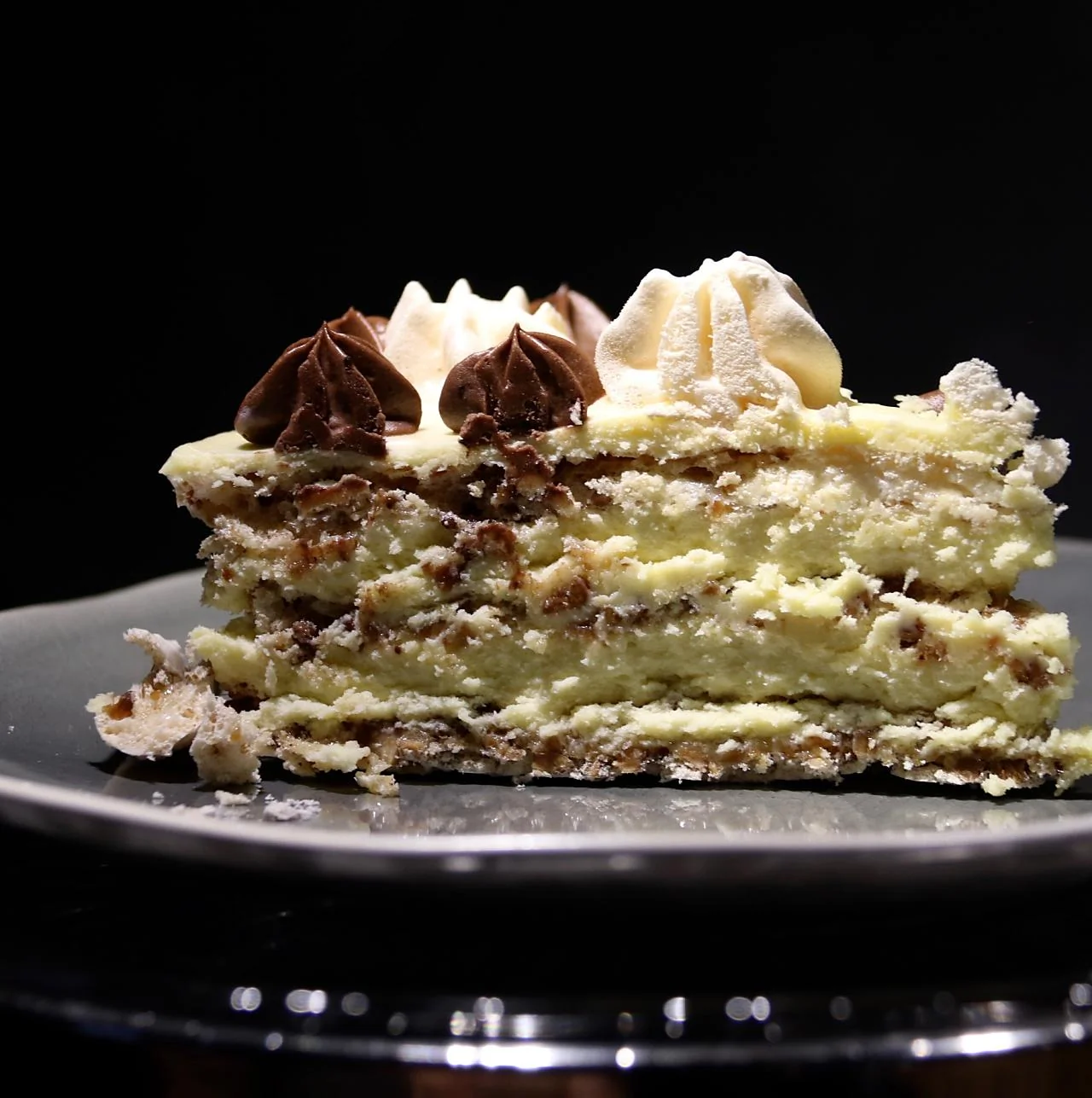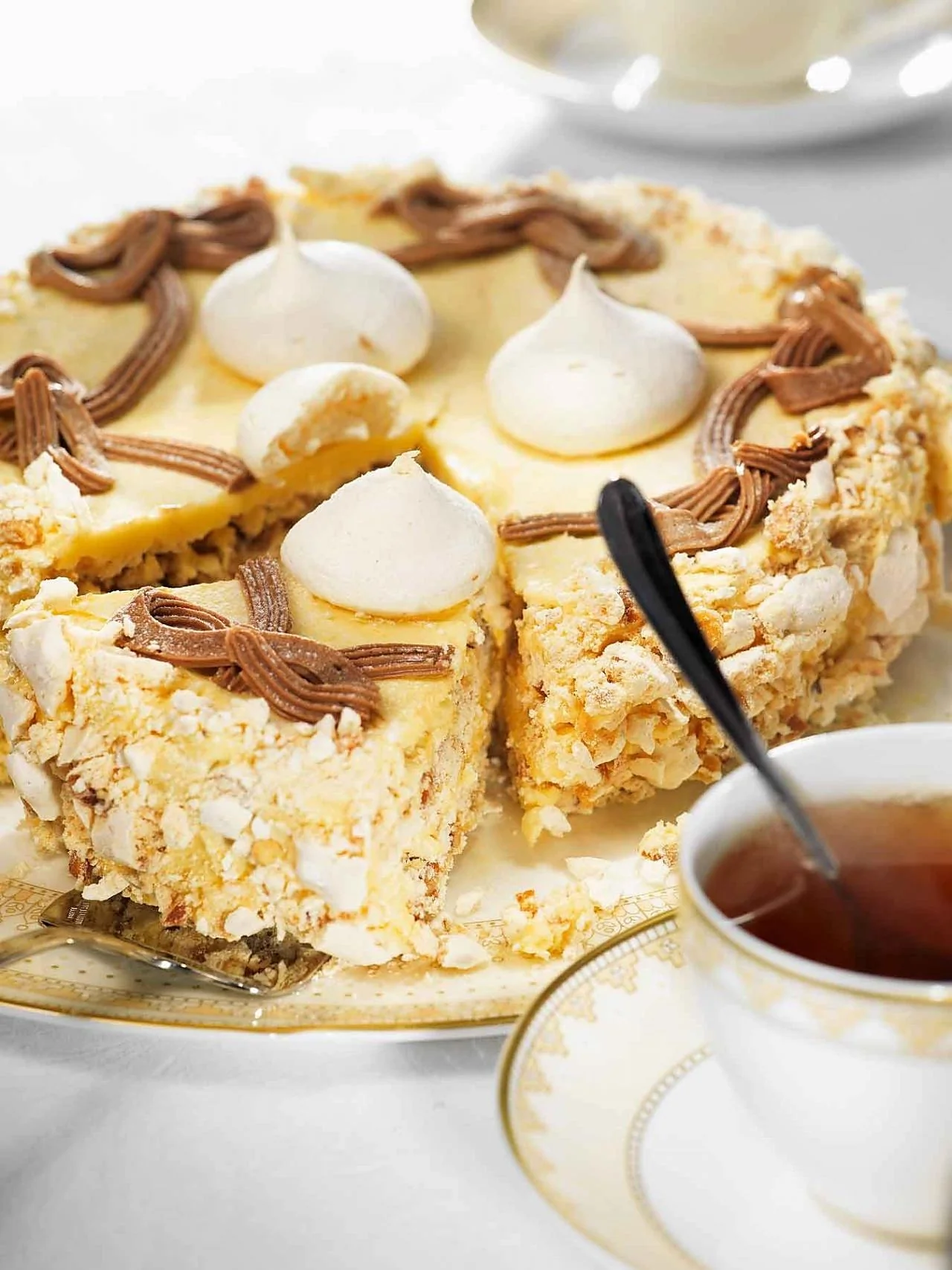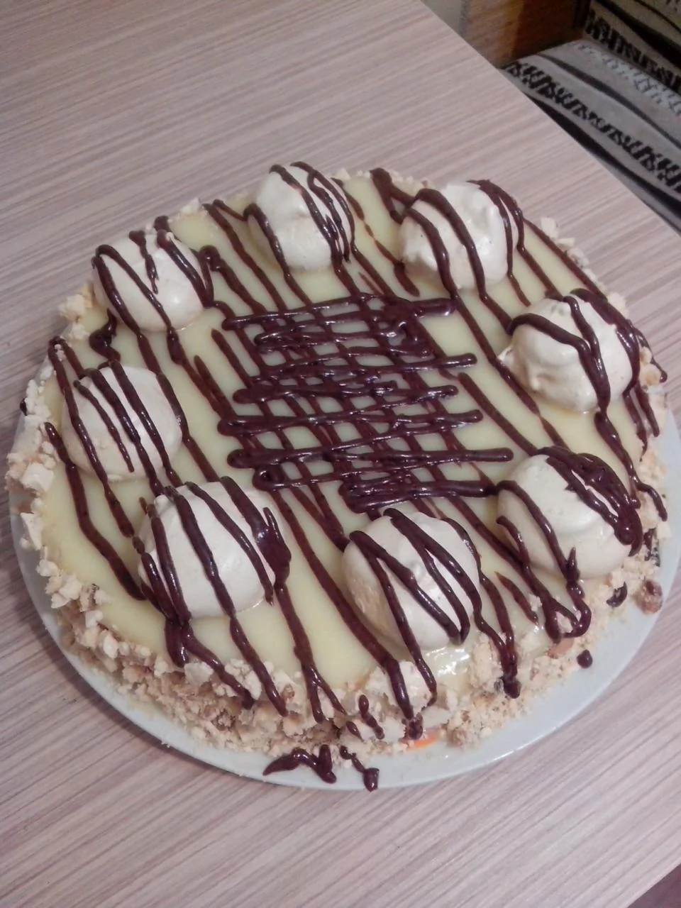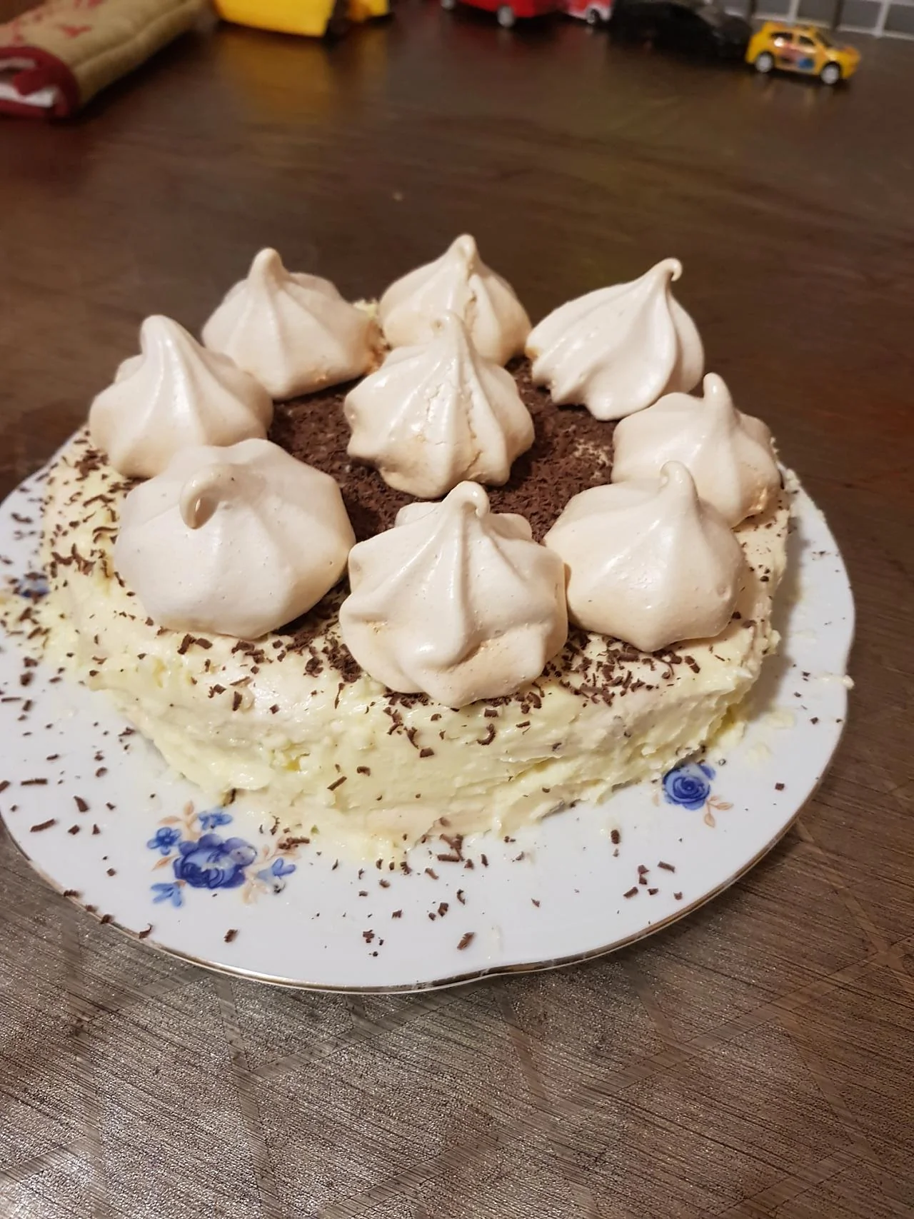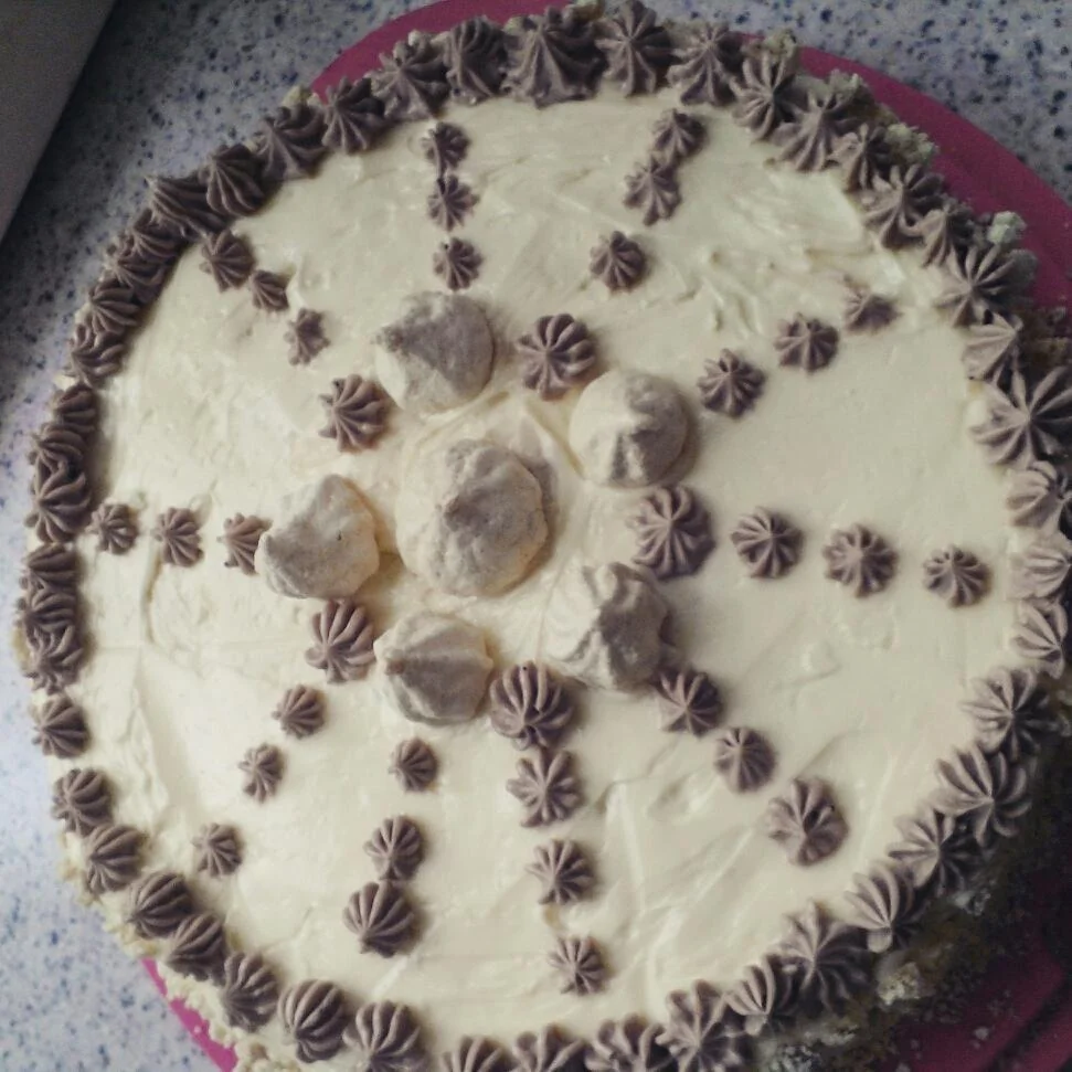 ШАГ 8 Половиной оставшегося крема намазать один корж, накрыть вторым коржом, обмазать бока и верх торта кремом, оставив немного для украшения. Кусочки орехового безе (те, что пеклись отдельно) истолочь в крошку и обсыпать ею бока торта. Украсить шоколадным и белым кремом и фигурками безе, поставить в холодильник не менее чем на час.