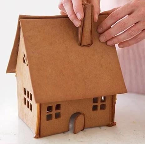 ШАГ 6 Смажьте края фронтона дома карамельным сиропом и немедленно приделайте крышу (будьте внимательны и прилаживайте крышу ровно и по центру).