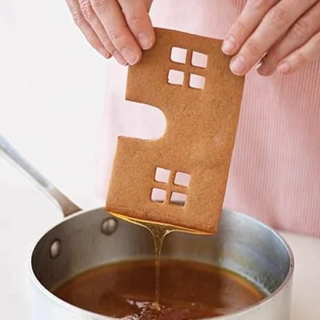 ШАГ 5 Обмакните один кончик фронтальной части будущего домика в миску с сиропом и дайте излишкам стечь, за один раз обрабатывайте только тот кончик, который вы будете соединять (собирать домик следует быстро, поскольку карамель затвердевает; клеиваемые фрагменты прижимайте друг к другу для лучшей адгезии). Повторите процедуру со всеми оставшимися элементами коробки дома.
