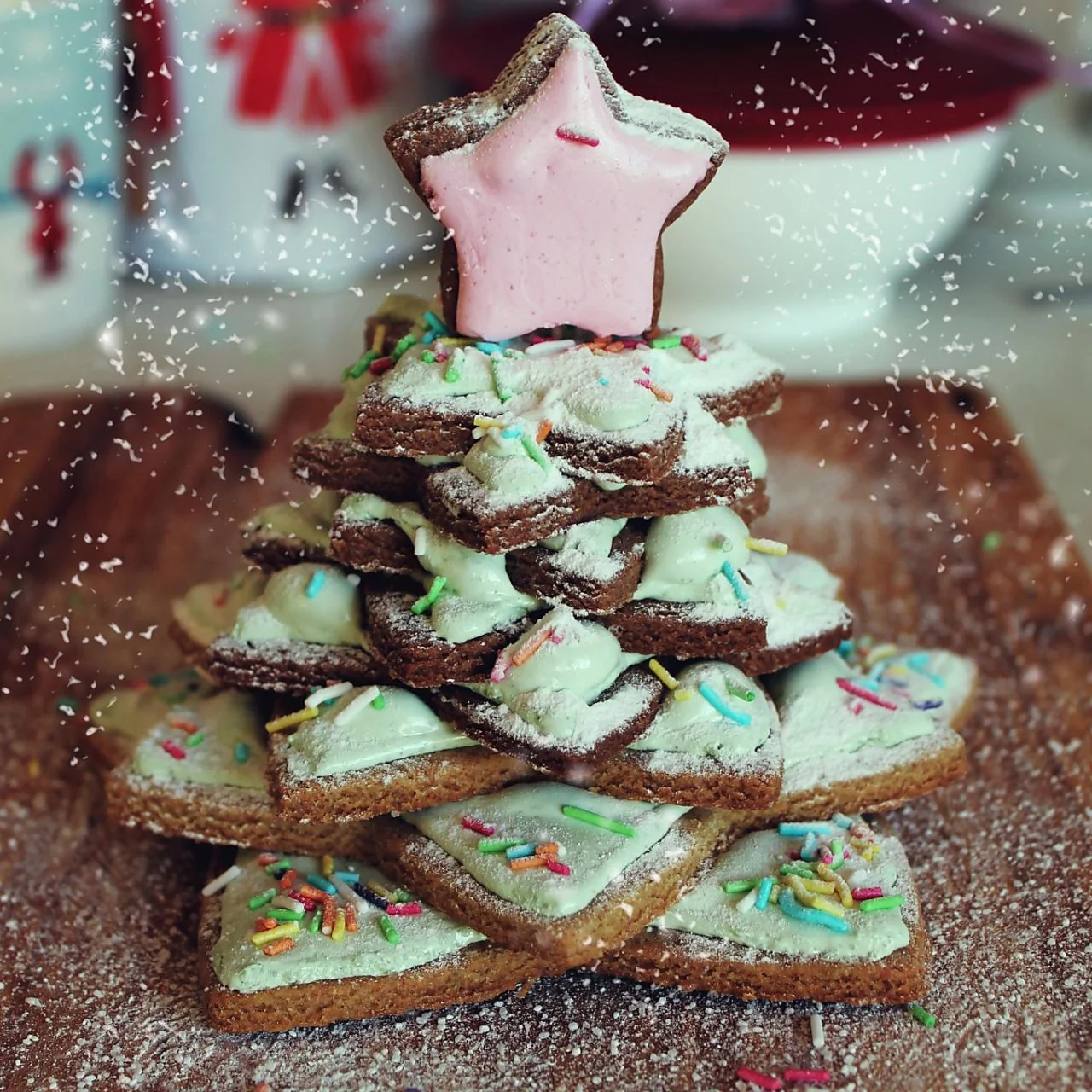ШАГ 5 Собираем елку! Готовое печение декорируем мятной глазурью и кондитерской посыпкой, затем,начиная от самого большого, насаживаем на деревянную шпажку, острым концом вверх. На верхушку елки можно насадить звезду из подкрашенного марципана или из того же печения, только с ягодной глазурью. Для имитации снега обсыпаем через сито сахарной пудрой.
