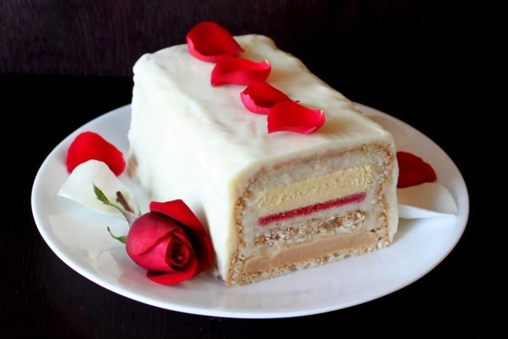 ШАГ 7 Первая часть сборки рождественского полена. Возьмите форму с выложенным в нее бисквитом дакуаз, заполните дно муссом из личи, формируя слой в 7 мм. Достаньте из морозилки крем-брюле и вырежьте из него прямоугольник (немного меньшего размера, чем форма в которой вы собираете полено). Положите в форму прямоугольник крем-брюле, на него — малиновое пюре. Уберите в холодильник до заморозки пюре, затем заполните муссом зазоры между прямоугольниками крем-брюле и малинового пюре и стенками формы. Сформируйте еще один слой мусса толщиной 5–7 мм. Достаньте из холодильника хрустящую вставку из шоколада, вырежьте из нее прямоугольник того же размера, что и крем-брюле, положите его в форму. Распределите поверх него оставшийся мусс. Уберите форму в морозилку.